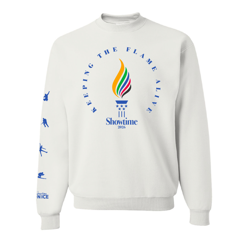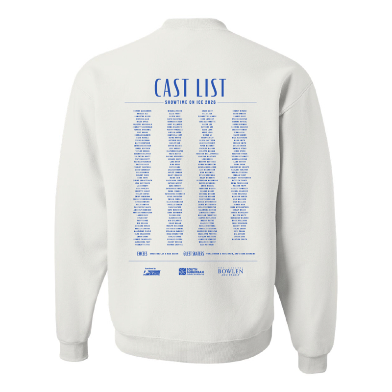 Celebrating our Winter Olympics and theme for the second half of the 2026 show!  Cast list and show Sponsor logos on the back. This design will be printed on white apparel and is available in a long sleeve t-shirt or crewneck sweatshirt.